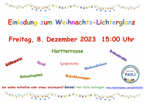 der Förderverein, die Gesamtelternvertretung und die Schulleitung laden Sie/Euch herzlich ein zum „Lichterglanz 2023“ am 8.12.2023 um 15:00 Uhr an der Hortterrasse.